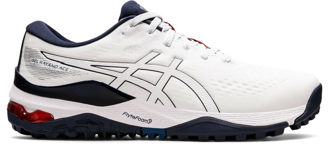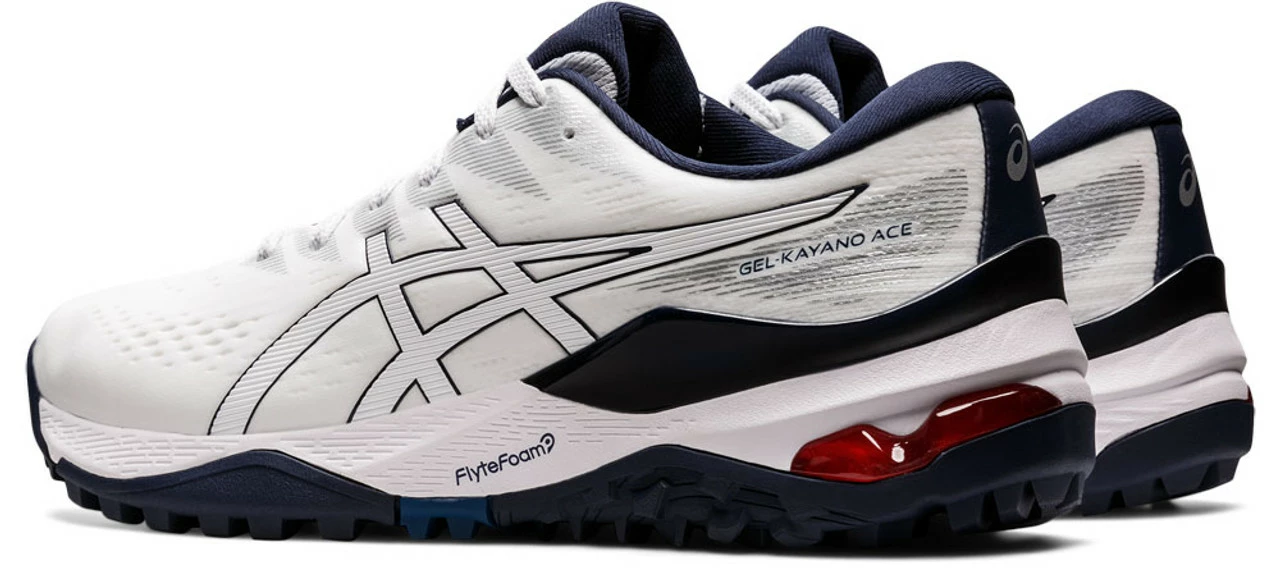 Your ace in the hole, every round. GEL-KAYANO ACE gives you ASICS comfort and performance with an air mesh vamp and TPU foot cradle plus tech like ultralight FlyteFoam and heel-side Gel Technology. Then the Flex Groove traction sole pattern places spikes and channels exactly where they need to be for a stable yet free feeling while swinging.