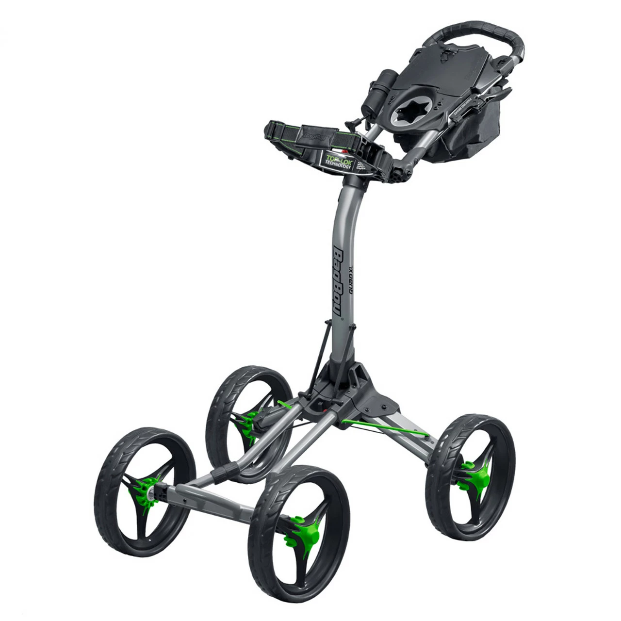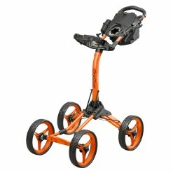 A patented bag-to-cart attachment system designed to securely lock a golf bag onto a push cart, preventing the bag from twisting or turning.